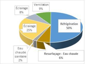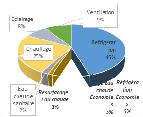 Le graphique de l’aréna de référence, ci-dessous, qui indique la consommation d’énergie pour chaque source de consommation, a été établi d’après un échantillonnage statistiquement pertinent de consommation de plus de 20 arénas au Québec effectué par CanmetÉNERGIE.